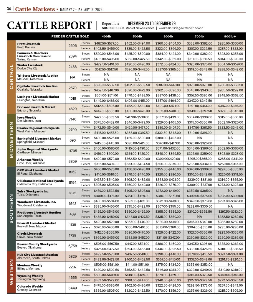 beef, Beef, Cattle Report, Central Region, Cow Calf, Feeder, Livestock Markets, Livestock Markets, Markets, Midwestern Region, Seedstock, Southern Region, Stocker, Western Region Cattle Report By HPJ Staff December 30, 2025 Listen Now 0:00 Explore More Cattle Report Stories… TAGS: Agriculture, Auction Barns, beef, cattle, cattle prices, cattle weights, central, economics, heifer, livestock, midwestern, southern, steer, western Related Articles Cattle Report Cattle Market Cattle Report Cattle Markets