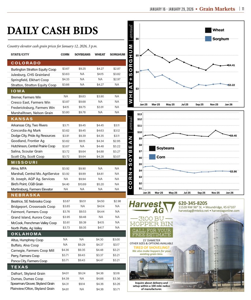Cash Bids, Central Region, Corn, Grain Markets, Grain Sorghum, Markets, Midwestern Region, Southern Region, Soybeans, Western Region, Wheat Cash Bids By HPJ Staff January 14, 2026 Listen Now 0:00 Explore More Daily Cash Bids Stories… TAGS: Agriculture, commerce, coops, corn, Daily Cash Bids, economics, elevators, prices, sorghum, soybeans, usda, wheat Related Articles Cash Bids Grain Report 11-28 Grain Cash Bids Grain Report