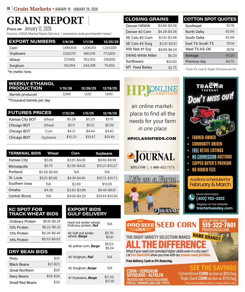 Central Region, Corn, Grain Markets, Grain Report, Grain Sorghum, Markets, Midwestern Region, Southern Region, Soybeans, USDA, Western Region, Wheat Grain Report By HPJ Staff January 14, 2026 Listen Now 0:00 Explore More grain report Stories… TAGS: Agriculture, Closing grains, commerce, corn, cotton spot quotes, dry beans, economics, ethanol, export, futures prices, grain prices, protein, soybeans, terminal bids, wheat Related Articles Grain Report Grain Report Grain Report Grain Report