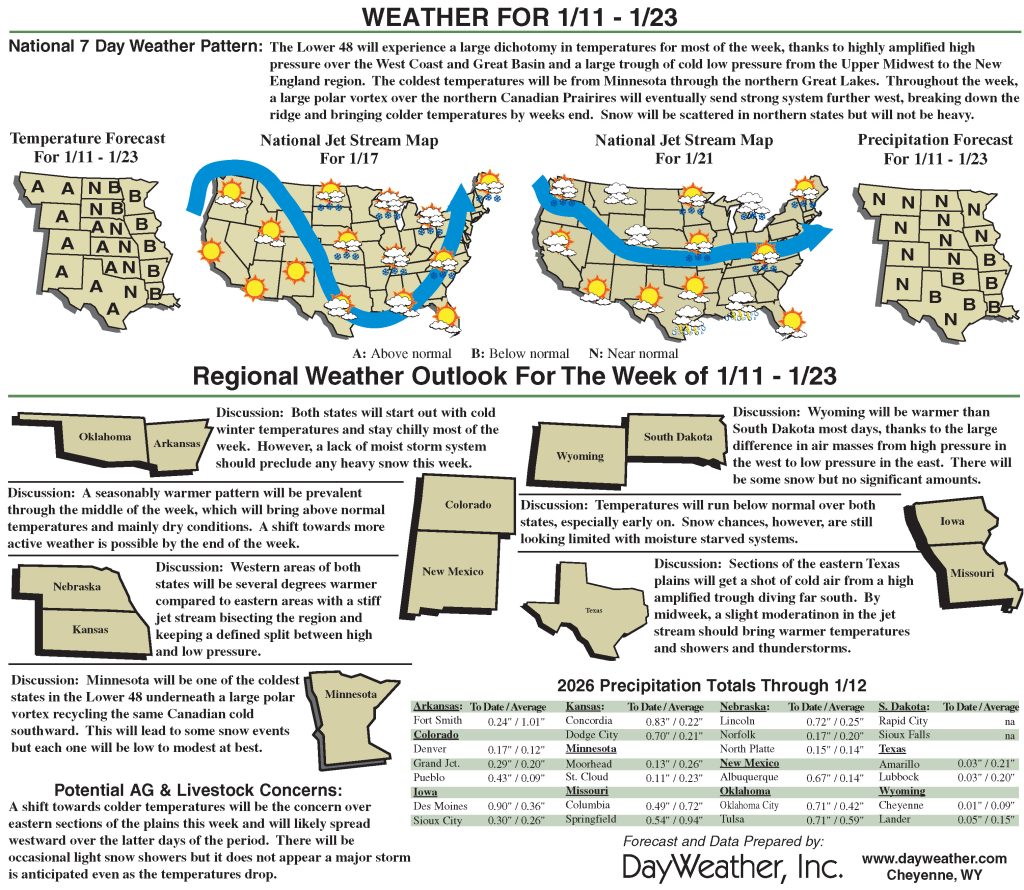 Temperatures during this time are anticipated to well above normal over the West, with departures of 10 to 13 degrees in Wyoming. Cooler-than-normal temperatures will be commonplace over the eastern half of the country, with the greatest departures over the upper Midwest and Great Lakes with departures of 10 to 13 degrees.