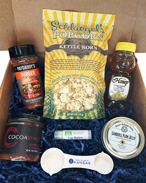 The limited-edition gift box is a unique way to celebrate Kansas by showcasing products created by hardworking Kansans. Each Kansas 250 Gift Box includes an assortment of items grown, raised, or produced in Kansas: Sandhill plum jelly, burger seasoning, honey, red wine chocolate, kettle corn popcorn, beeswax lip balm, and a complimentary From the Land of Kansas–branded measuring spoon.