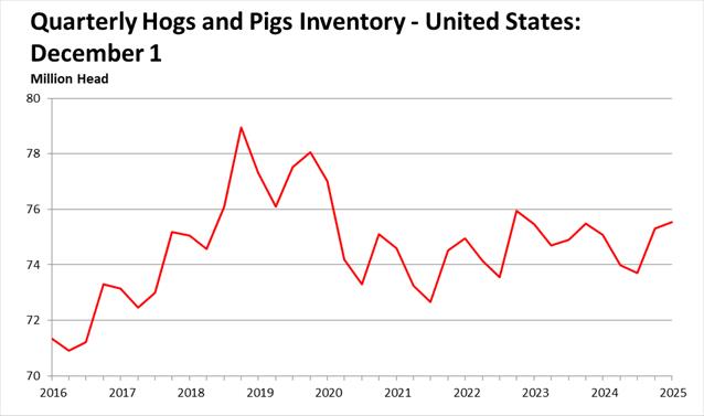 As of Dec.1, there were 75.5 million hogs and pigs on United States farms, up 1% from December 2024 and up slightly from Sept. 1, 2025, according to the Quarterly Hogs and Pigs report published Dec. 23 by the U.S. Department of Agriculture’s National Agricultural Statistics Service.