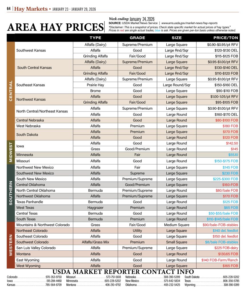 Area Hay Prices, Forage Crops, Hay Market News, Hay Range Pasture, Hay Report, Markets Area Hay Prices By HPJ Staff January 20, 2026 Listen Now 0:00 Explore More area hay prices Stories… TAGS: 3 Tie Small Square, alfalfa, area hay prices, bermuda grass, bluestem, Central Nebraska Hay, Central New Mexico Hay, Central Oklahoma Hay, Central Texas Hay, colorado hay, costal bermuda, East Wyoming Hay, fair hay, good hay, grass, grinding alfalfa, Hay delivered, hay market, Iowa Hay, kansas hay, large round bale, large square bale, meadow grass, Medium Bale, Minnesota Hay, missouri hay, Montains Northwest Colorado Hay, Montana hay, Mountains Colorado Hay, Nebraska hay, New Mexico Hay, North Central Kansas Hay, North Central Oklahoma Hay, Northeast Colorado Hay, Northwest Colorado Hay, Northwest Kansas Hay, Northwest New Mexico Hay, Northwest Oklahoma Hay, Oklahoma hay, Platte Valley Nebraska Hay, prairie grass, premium hay, San Luis Valley Colorado Hay, small square bale, South Central Kansas Hay, south dakota hay, South Hay, South Texas Hay, Southeast Colorado Hay, Southeast Kansas Hay, Southeast New Mexico Hay, Southwest Colorado Hay, Southwest Kansas Hay, Supreme hay, texas hay, Texas Panhandle Hay, timothy hay, West Texas Hay, West Wyoming Hay, wyoming hay Related Articles Area Hay Prices January 11, 2025 Area Hay Prices January 25, 2025 Area Hay Prices February 1, 2025 Area Hay Prices February 8, 2025