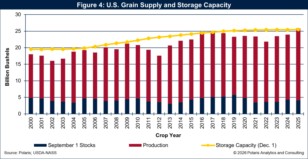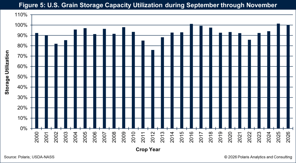 Still, the Sept. 1 stocks could be more than 4,800 million bushels, nearly 700 million bushels more than 2025 and the highest level since 2020. Taken together, Sept. 1 stocks and fall production, grain supplies this coming September through November would be about 25,500 million bushels, roughly 345 million less than this year’s supply level. If there were no changes to storage capacity, then grain storage across the U.S. would be fully utilized as shown in Figure 5. It is during periods of rising utilization that storage capacity expands