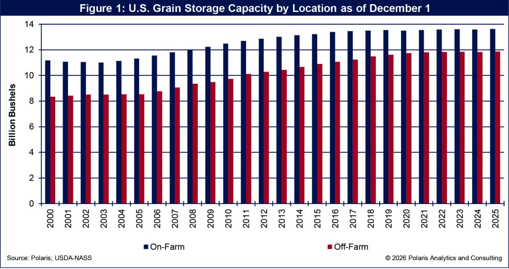 The share of capacity is unchanged since 2023 with on-farm having 53% of the capacity and off-farm at 47%. Grain storage capacity by location as of Dec. 1 is shown in Figure 1.
