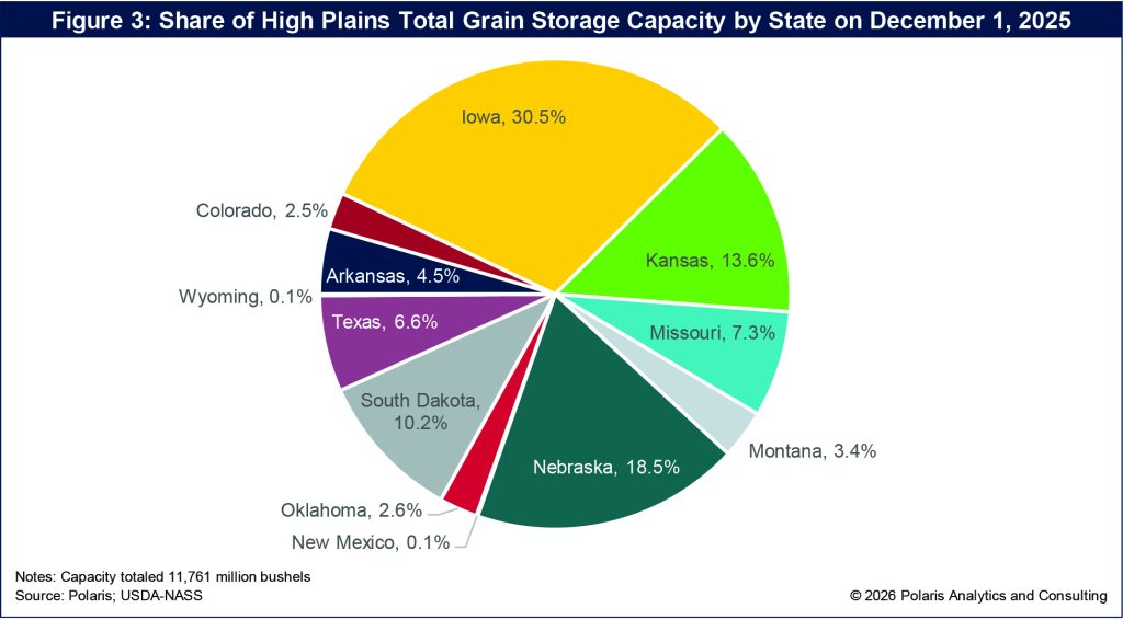 That regional capacity is not distributed evenly, and the state-by-state picture reveals how concentrated storage has become. Iowa’s grain storage capacity for example, was more than 30% of capacity across the High Plains during 2025, followed by Nebraska with nearly 19%, Kansas with 14% and South Dakota at 10% as shown in Figure 3.