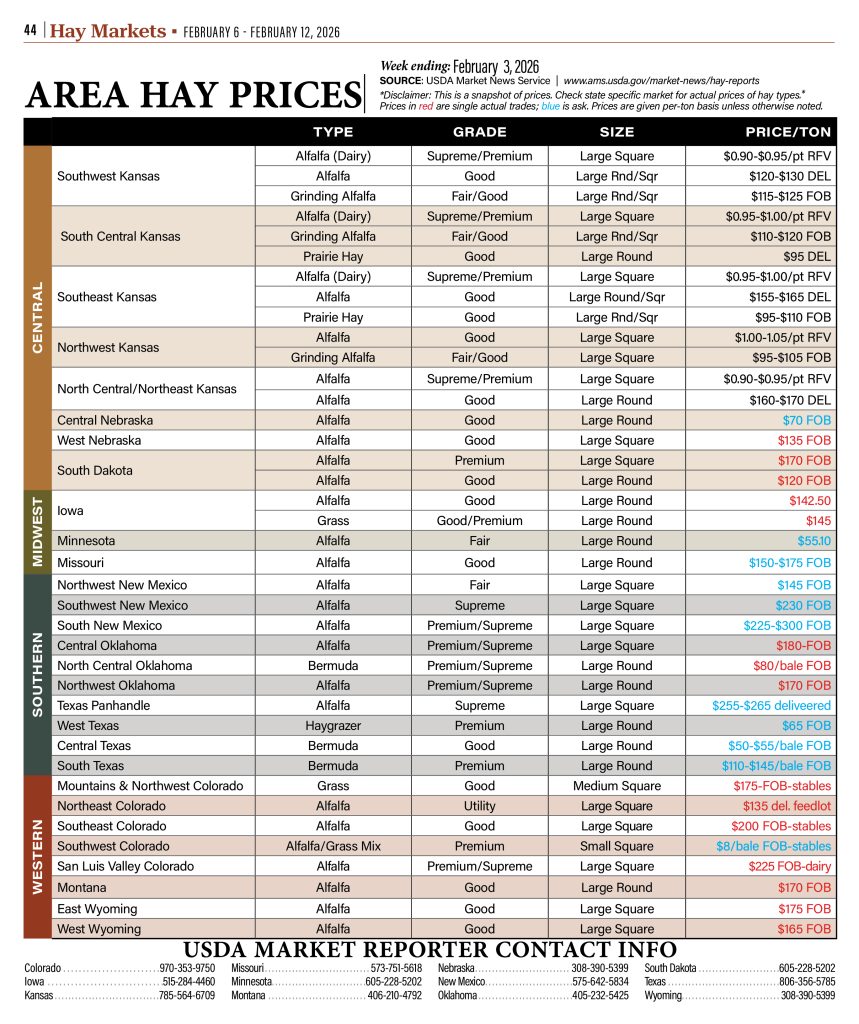 Area Hay Prices, Forage Crops, Hay Market News, Hay Range Pasture, Hay Report, Markets Area Hay Prices By HPJ Staff February 03, 2026 Listen Now 0:00 Explore More area hay prices Stories… TAGS: 3 Tie Small Square, alfalfa, area hay prices, bermuda grass, bluestem, Central Nebraska Hay, Central New Mexico Hay, Central Oklahoma Hay, Central Texas Hay, colorado hay, costal bermuda, East Wyoming Hay, fair hay, good hay, grass, grinding alfalfa, Hay delivered, hay market, Iowa Hay, kansas hay, large round bale, large square bale, meadow grass, Medium Bale, Minnesota Hay, missouri hay, Montains Northwest Colorado Hay, Montana hay, Mountains Colorado Hay, Nebraska hay, New Mexico Hay, North Central Kansas Hay, North Central Oklahoma Hay, Northeast Colorado Hay, Northwest Colorado Hay, Northwest Kansas Hay, Northwest New Mexico Hay, Northwest Oklahoma Hay, Oklahoma hay, Platte Valley Nebraska Hay, prairie grass, premium hay, San Luis Valley Colorado Hay, small square bale, South Central Kansas Hay, south dakota hay, South Hay, South Texas Hay, Southeast Colorado Hay, Southeast Kansas Hay, Southeast New Mexico Hay, Southwest Colorado Hay, Southwest Kansas Hay, Supreme hay, texas hay, Texas Panhandle Hay, timothy hay, West Texas Hay, West Wyoming Hay, wyoming hay Related Articles Area Hay Prices January 11, 2025 Area Hay Prices January 25, 2025 Area Hay Prices February 1, 2025 Area Hay Prices February 8, 2025