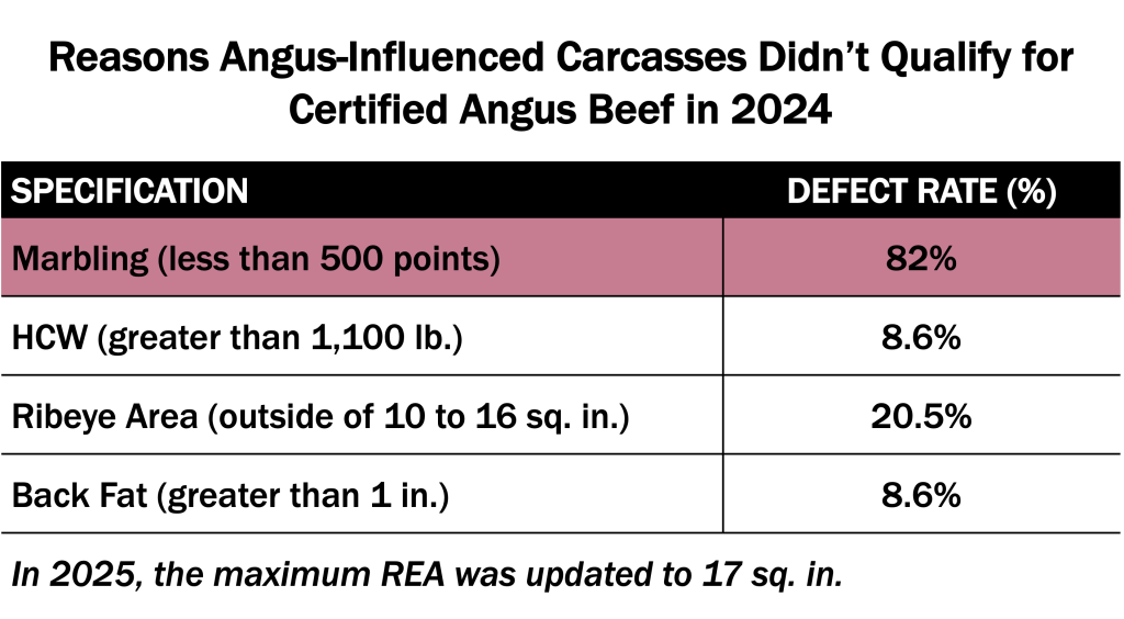 The Angus breed has a strong market share, with 72% of fed cattle being Angus-influenced. Still, only four in 10 head that meet the live animal specifications go on to meet all 10 CAB carcass specifications. In 2024, 82% of Angus-influenced cattle didn’t have enough marbling (CAB Consist Study).