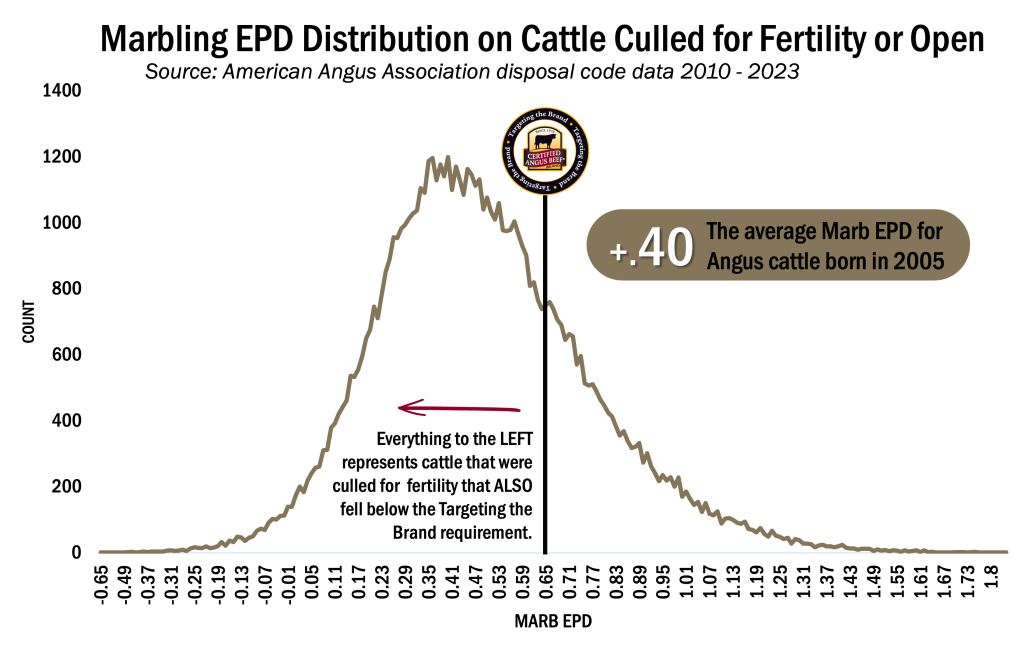 Caption for fertility graph: From 2010 to 2023, more than 72,000 females were culled from the herd due to being open or having other fertility issues. Many culls fall below the black line representing the Targeting the Brand minimum requirement for Marb EPD (+0.65.)