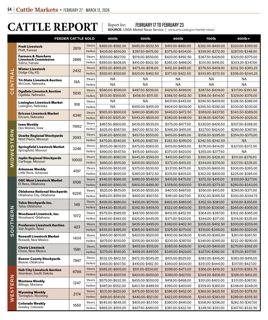 Cattle Report, Central Region, Livestock, Livestock Markets, Midwestern Region, Southern Region, Western Region Cattle Market By HPJ Staff February 26, 2026 Listen Now 0:00 Explore More Cattle Report Stories… TAGS: Agriculture, Auction Barns, cattle prices, cattle weights, commerce, economics, feedlots, food, heifer, livestock market, steer Related Articles Cattle Report Cattle Report Cattle Report Cattle Markets