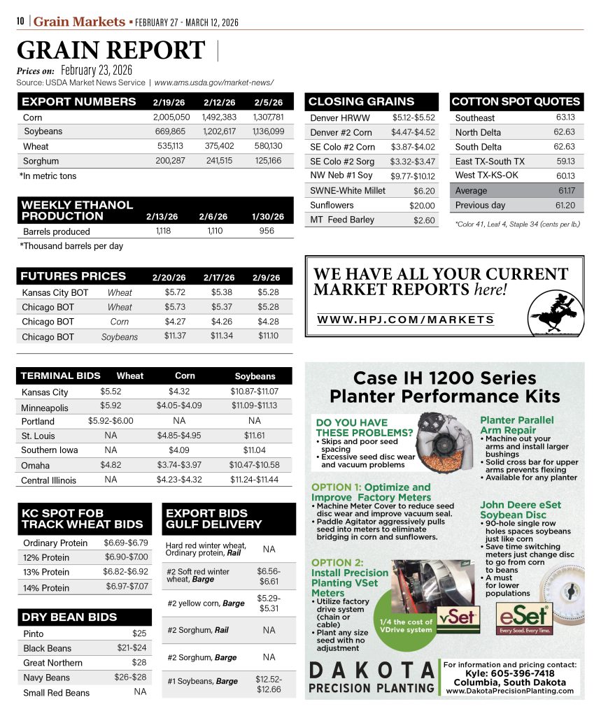 Corn, Grain Markets, Grain Report, Grain Sorghum, Soybeans, Wheat Grain Market Report By HPJ Staff February 26, 2026 Listen Now 0:00 Explore More grain report Stories… TAGS: Agriculture, commerce, cotton spot quotes, economics, export numbers, food, futures prices, grain report, weekly ethanol production Related Articles Grain Report Grain Report Grain Report Grain Report