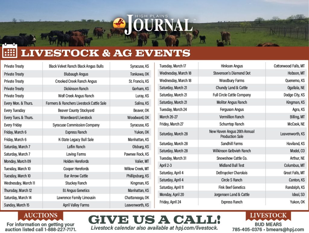 Livestock Calendar Livestock Calendar March 6 2026 By Heather Noll March 05, 2026 Listen Now 0:00 TAGS: Arkansas Weekly, Cattle Report, clovis livestock, colorado weekly, ericson livestock market, Farmers & Ranchers Livestock Commission Salina, Hub City Livestock Auction, iowa weekly, joplin regional stockyards, lexington livestock market, livestock, livestock market, Montana Weekly, ogallala livestock auction, OKC West Livestock Market, Oklahoma National Stockyards, ozarks regional stockyards, pratt livestock, Producers Livestock Auc tion, Roswell Livestock Market, Springfield Livestock Market, Tri-State Livestock Auction, tulsa stockyards, Winter Livestock, woodward livestock, Wyoming Weekly Related Articles Livestock Calendar October 31 2025 Livestock Calendar November 7 2025 Livestock Calendar November 14 2025 Livestock Calendar November 21 2025