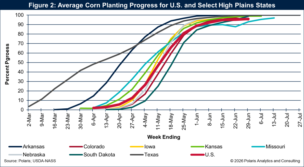 One reason caution can be a winning strategy in 2026 is time. Corn planting on the High Plains effectively runs from early March in Texas through April elsewhere and can stretch more than 10 weeks before the last planter stops in the northern fringe. Texas tends to start first and finish last, while states to the north compress more activity into a shorter window. The average corn planting pace across key states is shown in Figure 2.