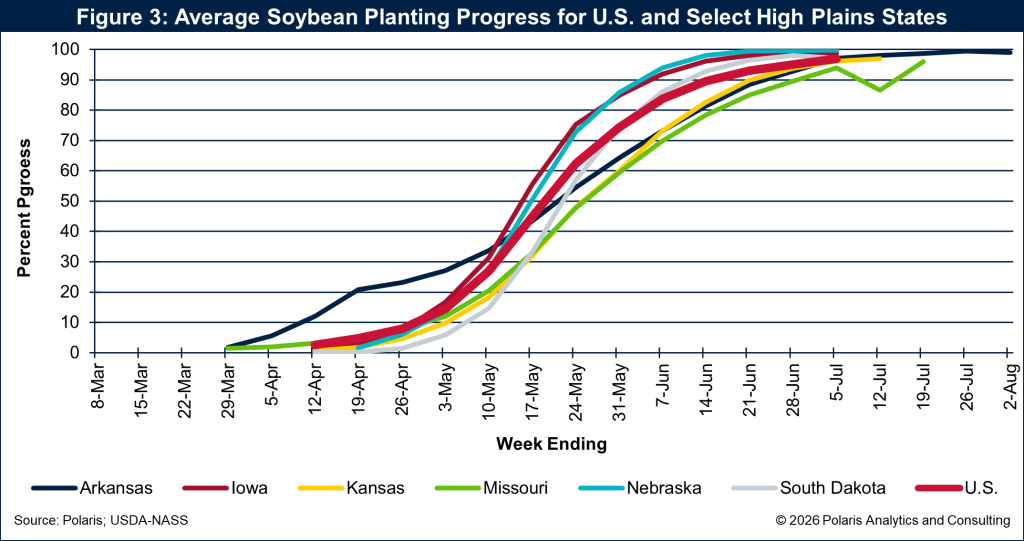 The soybean planting pace for the region is shown in Figure 3, and it highlights a practical advantage this spring: when economics favor soybeans, farmers can lean into that decision later in the season without ceding too much yield potential.