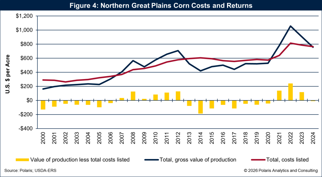 Soybeans generally land in the $650 to $680 per‑acre range, and wheat tallies closer to $400 to $500 depending on location and practice. These are ballpark figures, but they capture the spread most growers are seeing this winter.