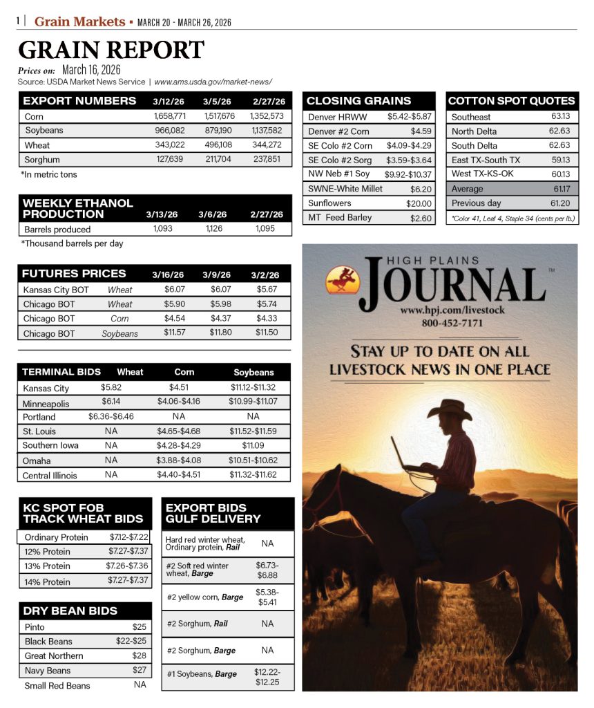 Central Region, Corn, Grain Markets, Grain Report, Grain Sorghum, Markets, Midwestern Region, Southern Region, Soybeans, Western Region, Wheat Grain Report By HPJ Staff March 19, 2026 Listen Now 0:00 TAGS: Agriculture, Closing grains, commerce, cotton, dry beans, economics, ethanol, exports, food, futures prices, spot cotton quotes Related Articles Grain Report Grain Report Grain Report Grain Report