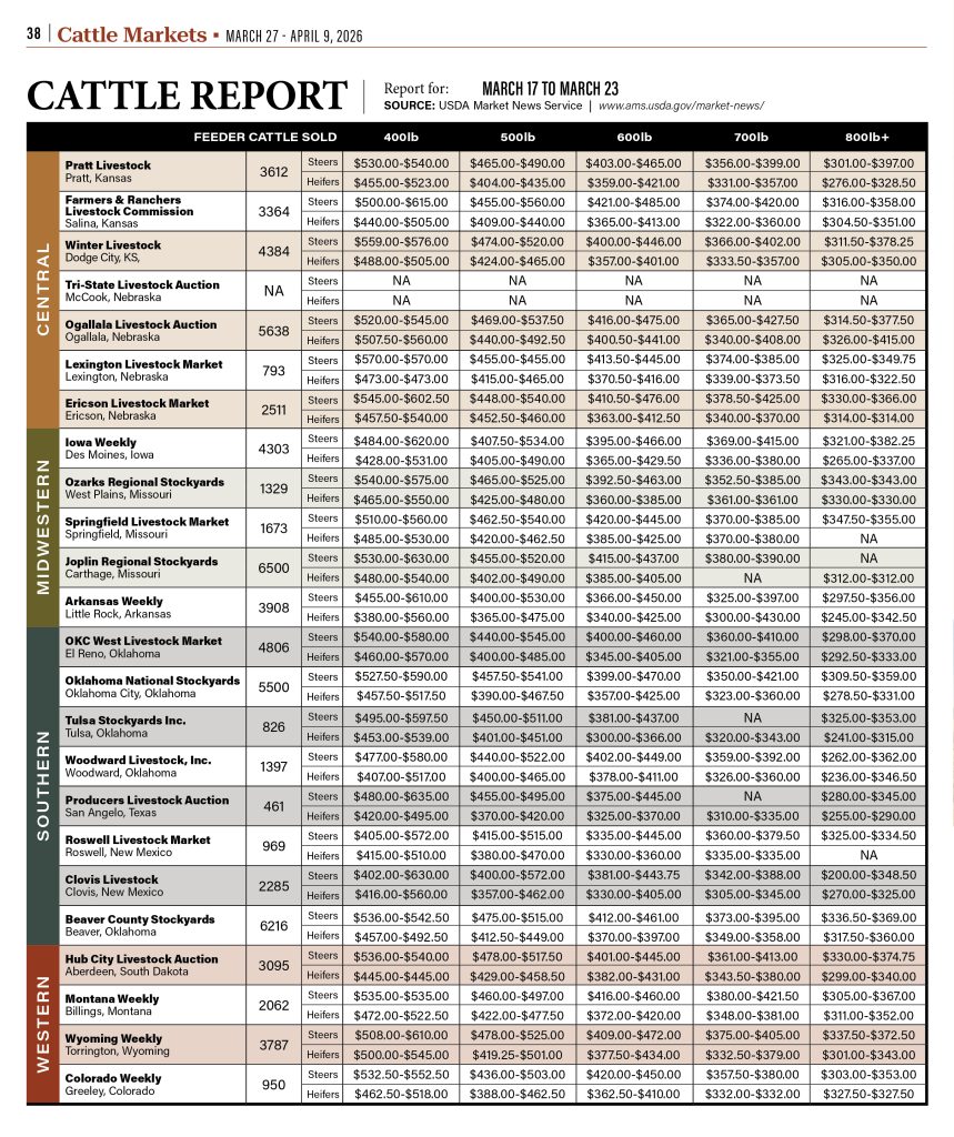 beef, Beef, Cattle Report, Central Region, Livestock, Livestock Markets, Midwestern Region, Southern Region, Western Region Cattle Report By HPJ Staff March 26, 2026 Listen Now 0:00 Explore More Cattle Report Stories… TAGS: Agriculture, Auction Barns, cattle prices, cattle weights, central, commerce, economics, feeder cattle, food, heifer, livestock, Livestock prices, midwestern, southern, steer, western Related Articles Cattle Report Cattle Report Cattle Report Cattle Markets