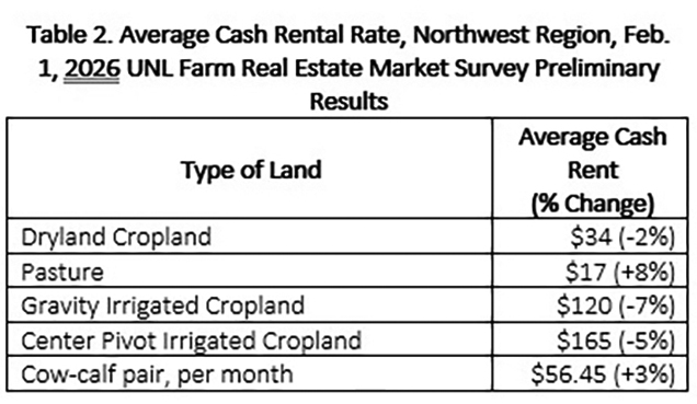 In the Northwest region, average farmland values increased 1% to $970 per acre for the reporting period ending Feb. 1, 2026. The region includes Banner, Box Butte, Cheyenne, Dawes, Deuel, Garden, Kimball, Morrill, Scotts Bluff, Sheridan and Sioux counties.