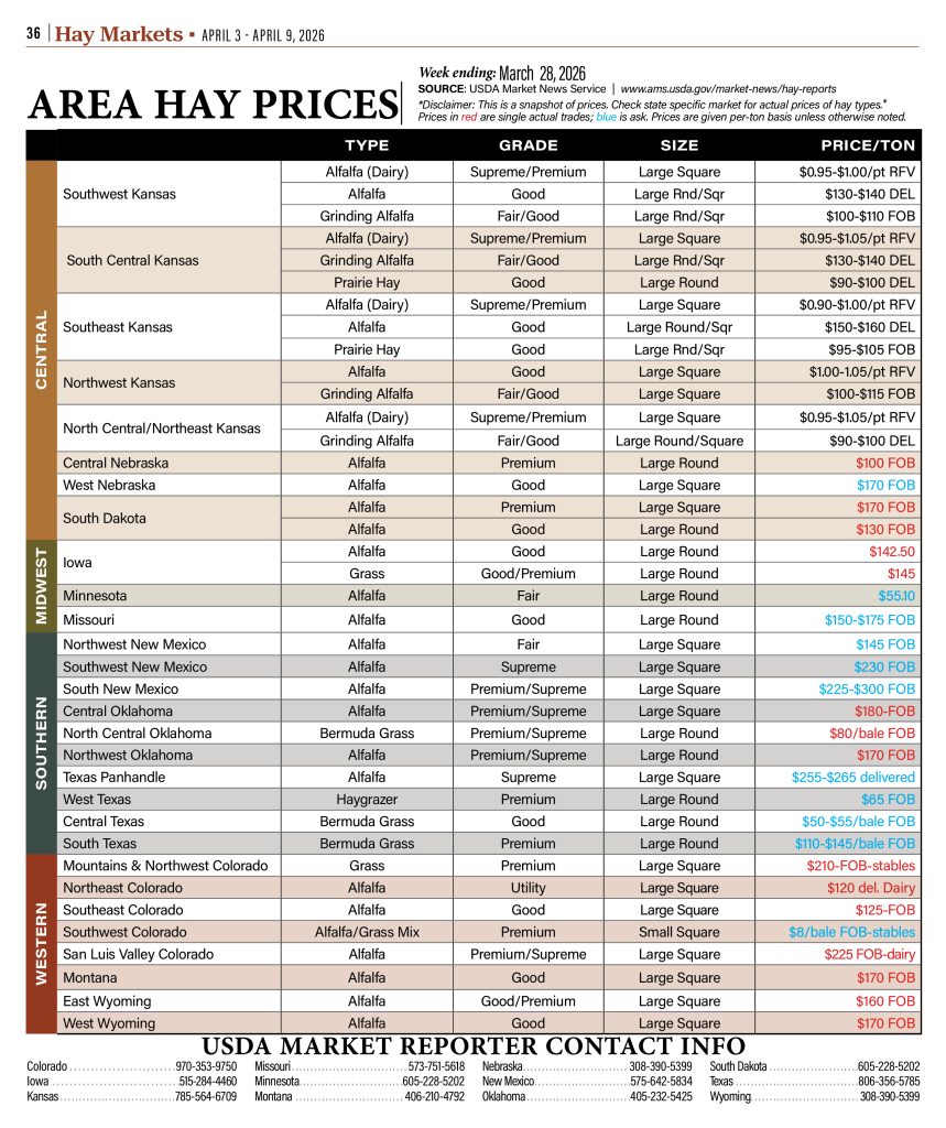 Area Hay Prices, Forage Crops, Hay Market News, Hay Range Pasture, Hay Report, Markets Area Hay Prices By HPJ Staff March 31, 2026 Listen Now 0:00 Explore More area hay prices Stories… TAGS: 3 Tie Small Square, alfalfa, area hay prices, bermuda grass, bluestem, Central Nebraska Hay, Central New Mexico Hay, Central Oklahoma Hay, Central Texas Hay, colorado hay, costal bermuda, East Wyoming Hay, fair hay, good hay, grass, grinding alfalfa, Hay delivered, hay market, Iowa Hay, kansas hay, large round bale, large square bale, meadow grass, Medium Bale, Minnesota Hay, missouri hay, Montains Northwest Colorado Hay, Montana hay, Mountains Colorado Hay, Nebraska hay, New Mexico Hay, North Central Kansas Hay, North Central Oklahoma Hay, Northeast Colorado Hay, Northwest Colorado Hay, Northwest Kansas Hay, Northwest New Mexico Hay, Northwest Oklahoma Hay, Oklahoma hay, Platte Valley Nebraska Hay, prairie grass, premium hay, San Luis Valley Colorado Hay, small square bale, South Central Kansas Hay, south dakota hay, South Hay, South Texas Hay, Southeast Colorado Hay, Southeast Kansas Hay, Southeast New Mexico Hay, Southwest Colorado Hay, Southwest Kansas Hay, Supreme hay, texas hay, Texas Panhandle Hay, timothy hay, West Texas Hay, West Wyoming Hay, wyoming hay Related Articles Area Hay Prices January 11, 2025 Area Hay Prices January 25, 2025 Area Hay Prices February 1, 2025 Area Hay Prices February 8, 2025
