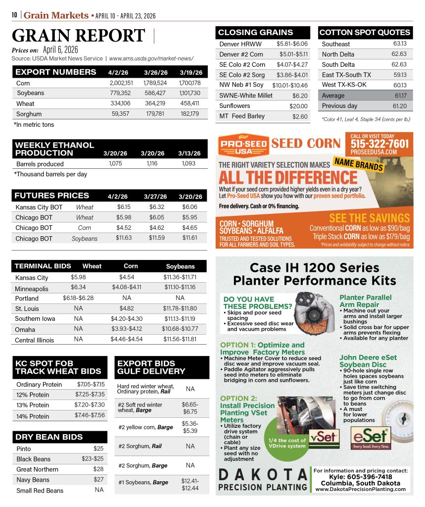 Corn, Crops, Grain Markets, Grain Report, Grain Sorghum, Markets, Soybeans, Wheat Grain Markets By HPJ Staff April 08, 2026 Listen Now 0:00 Explore More grain report Stories… TAGS: Agriculture, commerce, cotton spot quotes, dry bean bids, economics, ethanol production, export numbers, food, futures prices, grain prices, gulf delivery, terminal bids, USDA report Related Articles Grain Report Grain Report Grain Report Grain Report