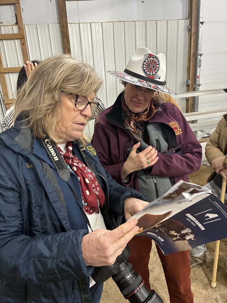 Sheila Jensen of Jensen Ranch discusses the Hereford bull offerings in their sale catalog with a trade mission delegate from Chihuahua, Mexico, during a multi-state trade mission focused on U.S. beef cattle genetics hosted by the Kansas Department of Agriculture. (Courtesy photo.)
