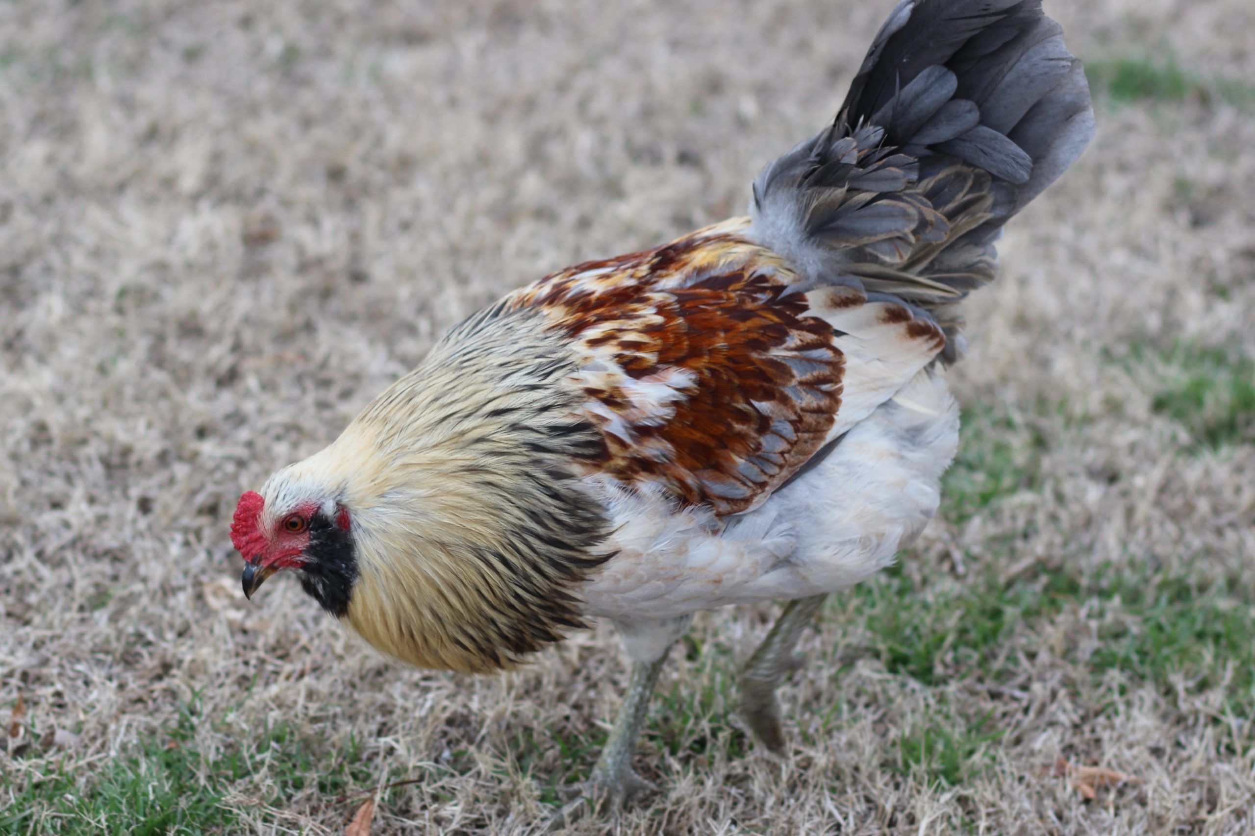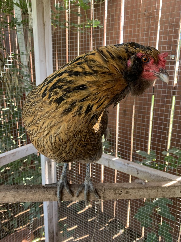 This is an Easter egger rooster. Notice the unique coloring, small pea comb, feather beard and muffs around the face and greenish legs. (Journal photo by Lacey Vilhauer.)
