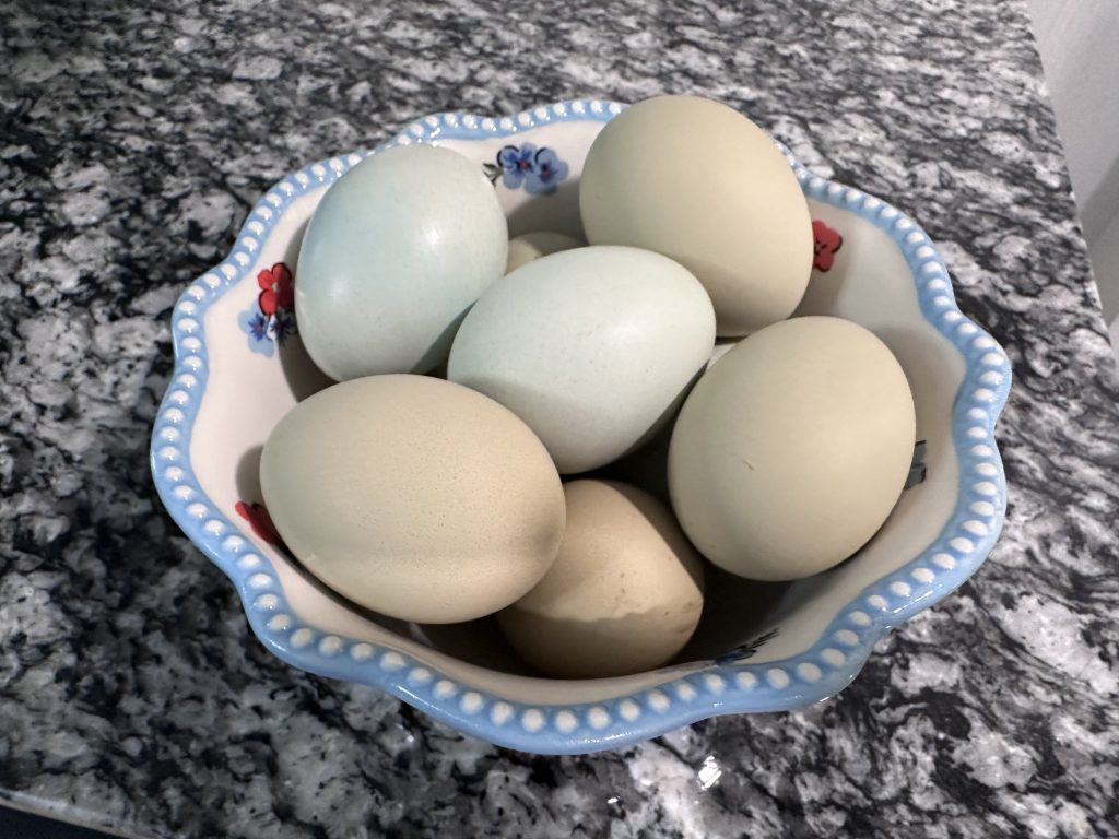 Blue and green-colored Easter-egger eggs. (Journal photo by Lacey Vilhauer.)