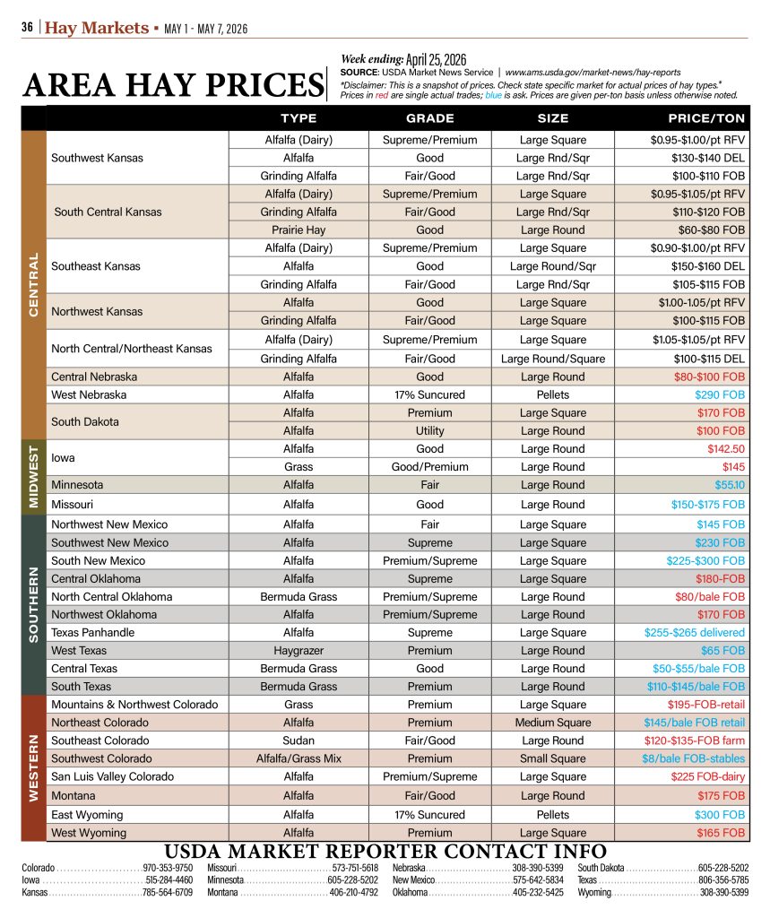 Area Hay Prices, Forage Crops, Hay Market News, Hay Range Pasture, Hay Report, Markets Area Hay Prices By HPJ Staff April 28, 2026 Listen Now 0:00 Explore More area hay prices Stories… TAGS: 3 Tie Small Square, alfalfa, area hay prices, bermuda grass, bluestem, Central Nebraska Hay, Central New Mexico Hay, Central Oklahoma Hay, Central Texas Hay, colorado hay, costal bermuda, East Wyoming Hay, fair hay, good hay, grass, grinding alfalfa, Hay delivered, hay market, Iowa Hay, kansas hay, large round bale, large square bale, meadow grass, Medium Bale, Minnesota Hay, missouri hay, Montains Northwest Colorado Hay, Montana hay, Mountains Colorado Hay, Nebraska hay, New Mexico Hay, North Central Kansas Hay, North Central Oklahoma Hay, Northeast Colorado Hay, Northwest Colorado Hay, Northwest Kansas Hay, Northwest New Mexico Hay, Northwest Oklahoma Hay, Oklahoma hay, Platte Valley Nebraska Hay, prairie grass, premium hay, San Luis Valley Colorado Hay, small square bale, South Central Kansas Hay, south dakota hay, South Hay, South Texas Hay, Southeast Colorado Hay, Southeast Kansas Hay, Southeast New Mexico Hay, Southwest Colorado Hay, Southwest Kansas Hay, Supreme hay, texas hay, Texas Panhandle Hay, timothy hay, West Texas Hay, West Wyoming Hay, wyoming hay Related Articles Area Hay Prices January 11, 2025 Area Hay Prices January 25, 2025 Area Hay Prices February 1, 2025 Area Hay Prices February 8, 2025