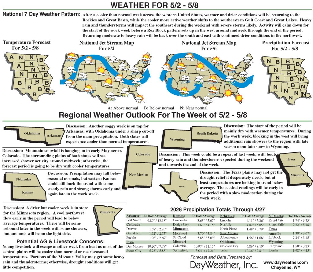 The National Weather Service’s 6- to 10-day outlook for May 5 to 9 calls for the likelihood of cooler-than-normal conditions in most areas east of the Rockies, while warmer-than-normal weather will be confined to an area stretching from the Pacific Coast to the northern Rockies, including the Great Basin and northern Intermountain West.
