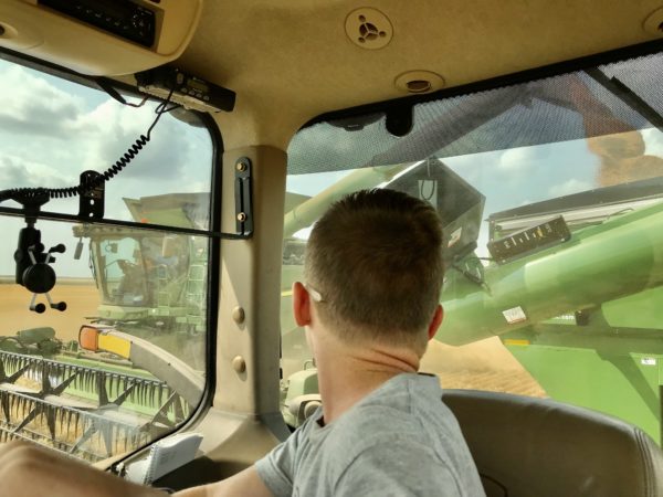 These big, open fields are an ideal place to learn the ropes of equipment operation. With close supervision, Titus drives the grain cart while Ezra unloads the combine on the go for the very first time. It’s a proud parent moment.